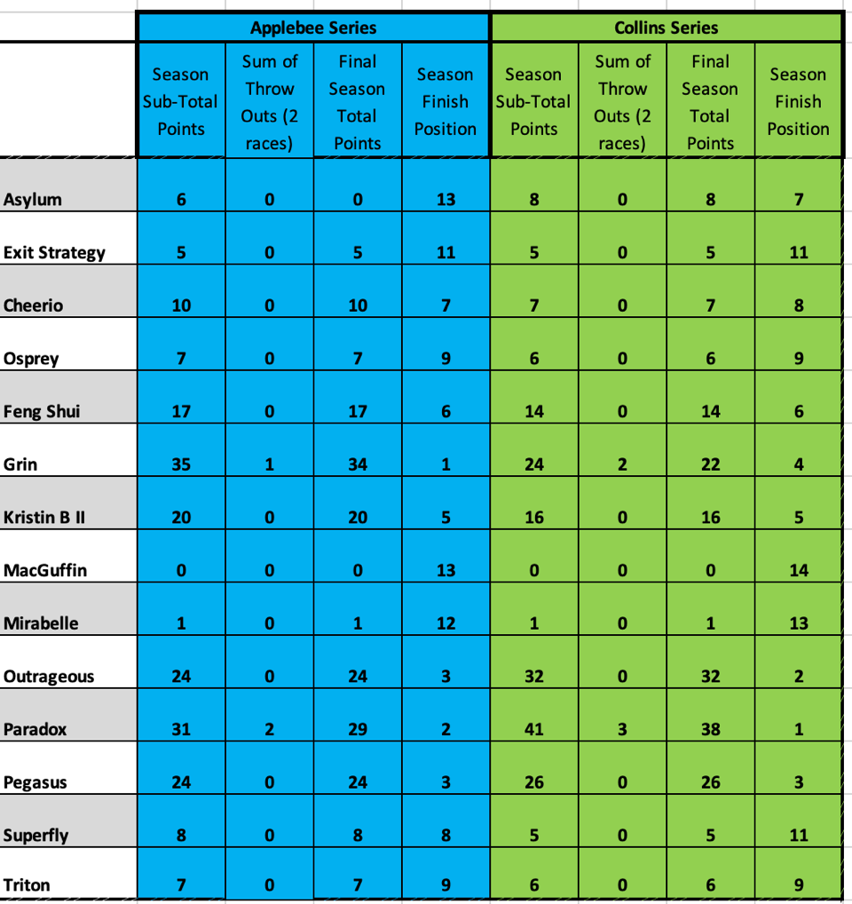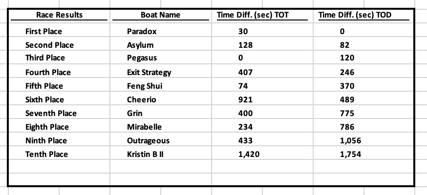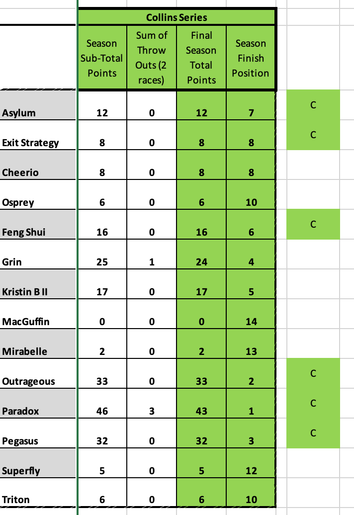 June 21 (no race) – June 28 – July 5 – July 12 (standings after week 4) – July 19 – July 26 (standings after week 6)- August 2 (standings after race 7) – August 9 – August 16 (standings after week 9) (Handicaps as of race #10 on August 23) – August 23 (standings after week 10) – August 30 Finton Cup