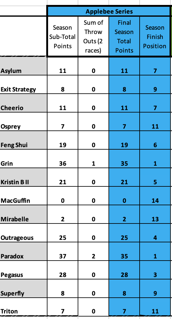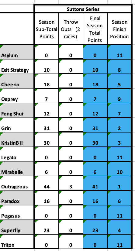 June 17 (no race) – June 24 – July 1 – July 8 – July 15 – July 22 – July 29 – August 5 – August 12 – August 19 – August 26 Suttons Series Final Results